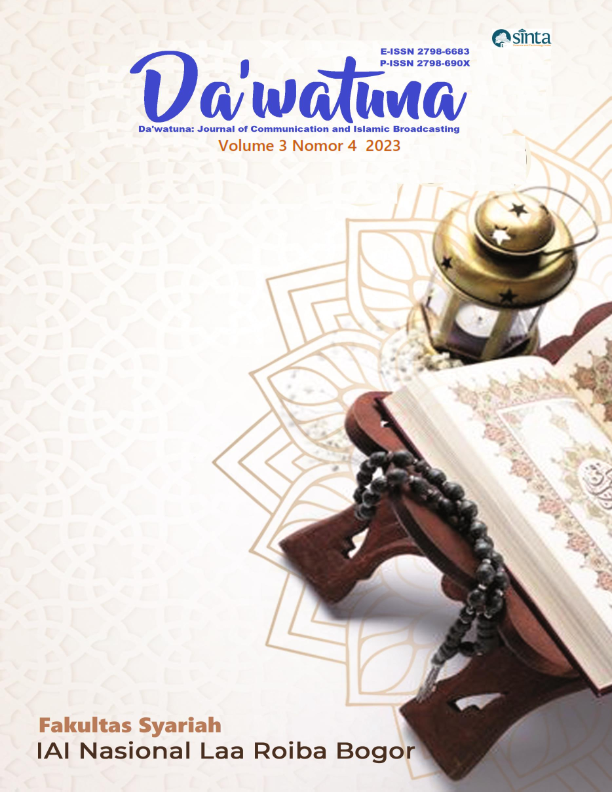 Vol. 4 No. 5 (2024)Da'watuna: Journal of Communication and Islamic Broadcasting is a peer-reviewed national journal on communication, da'wah, broadcasting, education and Islamic studies managed by Institut Agama Islam Nasional (IAI-N) Laa Roiba Bogor in cooperation with Masyarakat Ekonomi Syariah (MES) and Intelectual Association for Islamic Studies (IAFORIS) . This journal focused on communication, dakwah, broadcasting, education, and Islamic studies through the publication of articles, research reports, and book reviews. The Journal is published. The Journal is published six times a year on Febuary, April, July, August, October and December.. The aim of the journal is to disseminate the communication, da'wah, broadcasting, and Islamic studies researches done by researchers. Specifically, the journal will deal with topics, including but not limited to: Broadcasting, Communication, Dakwah & Islamic propagation, Islamic education, Islamic studies, Islamic education, and other related issues. E-ISSN E-ISSN 2798-6683P-ISSN 2798-690X. . Starting from Volume 1 Number 1 2021 to Volume 5 Number 1 of 2024 published on the website with the URL https://journal.laaroiba.ac.id/index.php/dawatuna. Starting from Volume 5 Number 2 2024 onwards it will be published with the URL https://journal-laaroiba.com/ojs/index.php/dawatuna. This journal is accredited by Sinta 5 based on the Decree of the Director General of Higher Education, Research and Technology of the Ministry of Education, Culture, Research and Technology No. 0385/E5.3/KI.02.00/20221 (page 81) starting from Vol 1 No 1 2021 to Vol 5 No 2 2025.